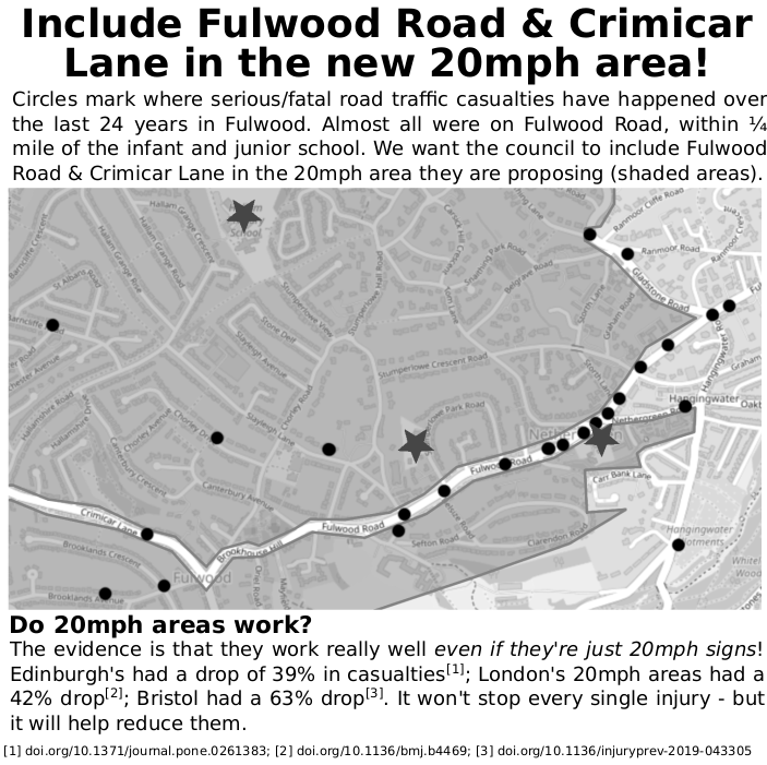 300 serious/fatal road collisions happen each year in the city[1] but Sheffield Council policy is based on decades-old research and still specifically excludes main residential roads (even those with schools and shops!!) from being 20mph, even though this is where almost all the serious and fatal collisions occur.